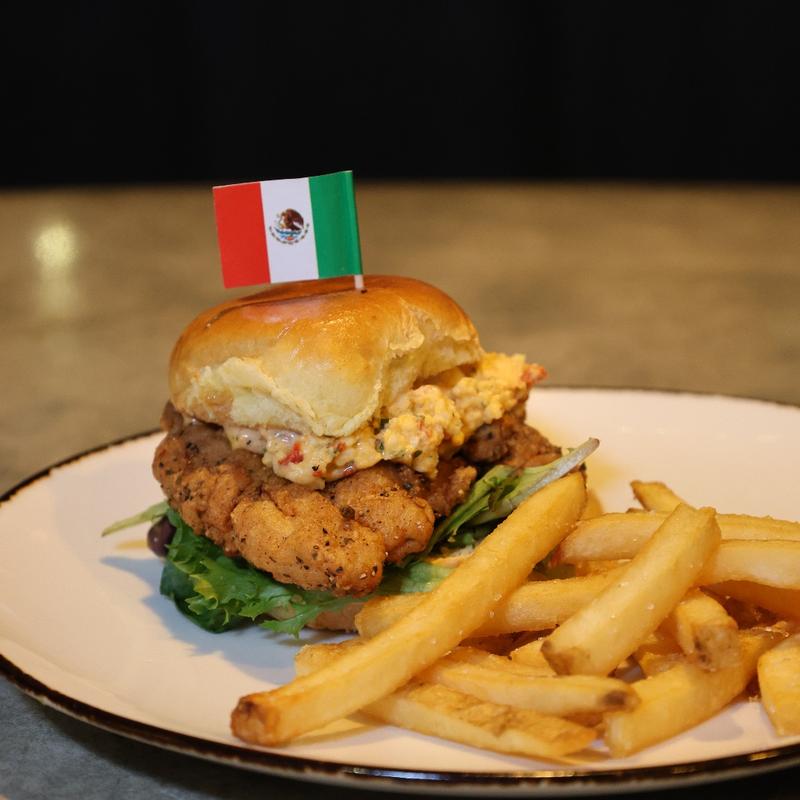 Spicy fried chicken smothered in buffalo sauce, pimento cheese, chipotle aioli, and mixed greens on a buttery brioche bun. Served with fries.
