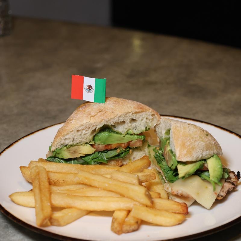 Grilled chicken, pesto, arugula, avocado, tomato & pepper jack on ciabatta. Served with fries.
